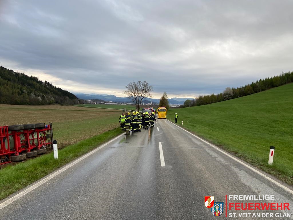 Aus unbekannter Ursache kam in der Früh ein mit Salzsäure beladener Sattelzug von der Töscheldrofer Straße (Althofen) ab und landete in weiterer Folge seitlich in einem Acker.